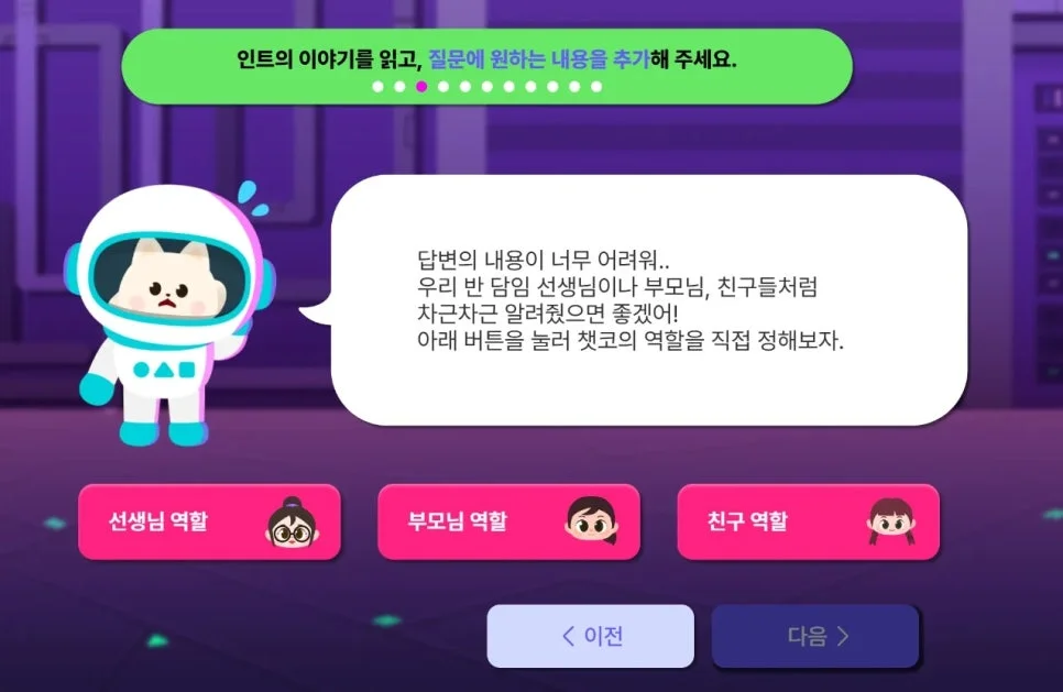 Chat GPT등 다양한 생성형 AI들이 만 14세 미만의 아이들에게는 이용 제한을 걸어두고 있어요. 하지만 그 전부터 생성형 AI를 활용하는 방법을 아이들도 알고 있어야 한다는 생각으로 코드모스는 챗코를 만들었습니다. 챗코와의 대화를 통해서 원하는 답변을 얻기 까지 필요한 프롬프트 작성법을 게이미피케이션 형식으로 구성되어 있습니다.