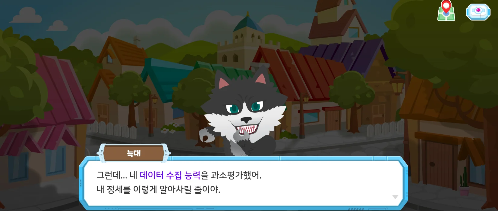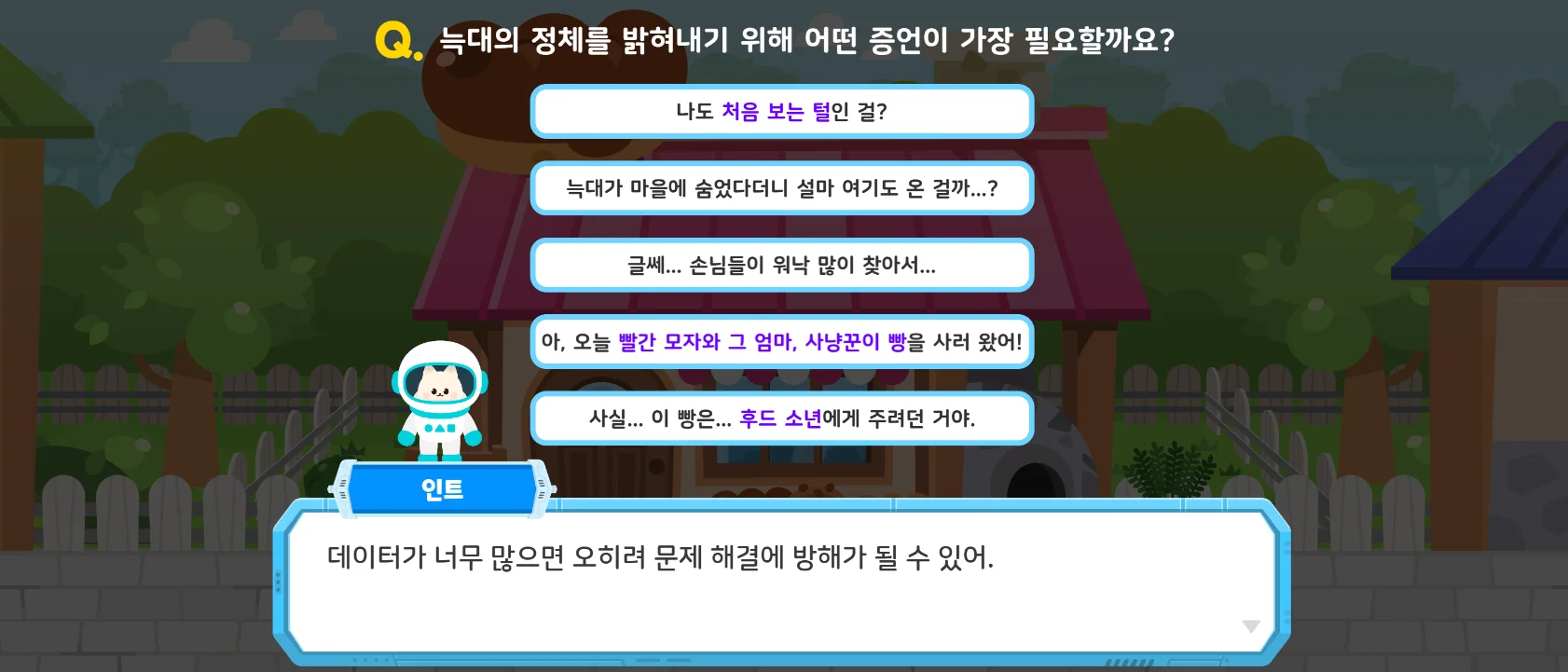 뿐만 아니라 이 데이터를 어떤 방식으로 수집하고 활용해야 할지도 담아냈죠. 바로 변장한 늑대를 찾기 위한 근거 수집을 위해서요! 증언, 증거 등 다양한 형태로 뿌려져 있는 근거를 바탕으로 추리해야하기 때문에 학생들은 적합한 데이터 수집 방법을 선택해야 하죠.