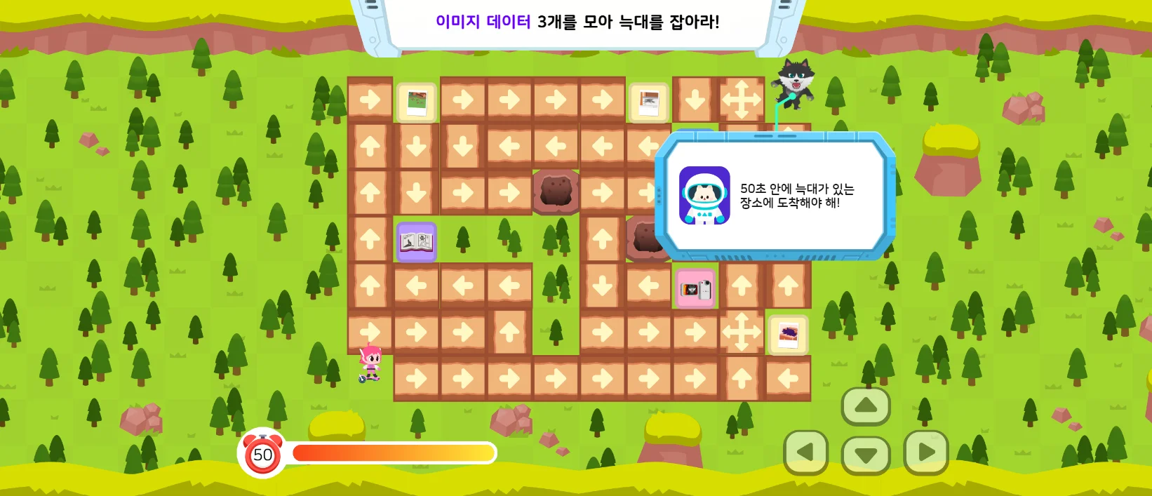 SW 교육 콘텐츠 답게 코드모스는 컴퓨팅 사고력 부분도 놓치지 않았습니다! 변장한 늑대를 알아내면 늑대가 도망가는데요. 바로 이 늑대를 잡기 위한 복잡한 미로가 등장합니다. 자동으로 이동하는 화살표 미로 길을 찾아 늑대가 있는 곳까지 도착해야 하는 방식으로 구성되어 있기 때문에 단순한 미로가 아닙니다. 컴퓨팅 사고력을 활용해 풀어야하는 미로로 데이터 수집은 물론 컴퓨팅 사고력까지 가져갈 수 있는 콘텐츠입니다.