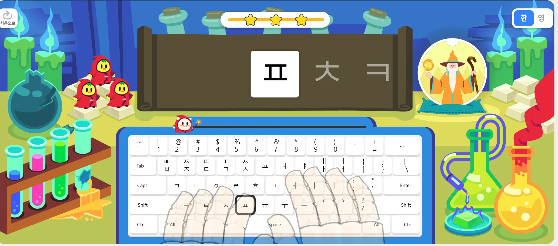 ‘키보드 자리 익히기’, 코드모스 내 학생들에게는 ‘매직 핑거’라는 행성으로 보이는 이 코스는 키보드의 기본 자리를 체계적으로 익히며 더 나아가 한/영 전환키를 통해 한글은 물론 영어 타자 연습도 가능한 학습 콘텐츠 입니다. 단순한 자리를 넘어 간단한 문장 연습까지 제공해 현장의 초등학교 선생님들에게 큰 호응을 받기도 했습니다.