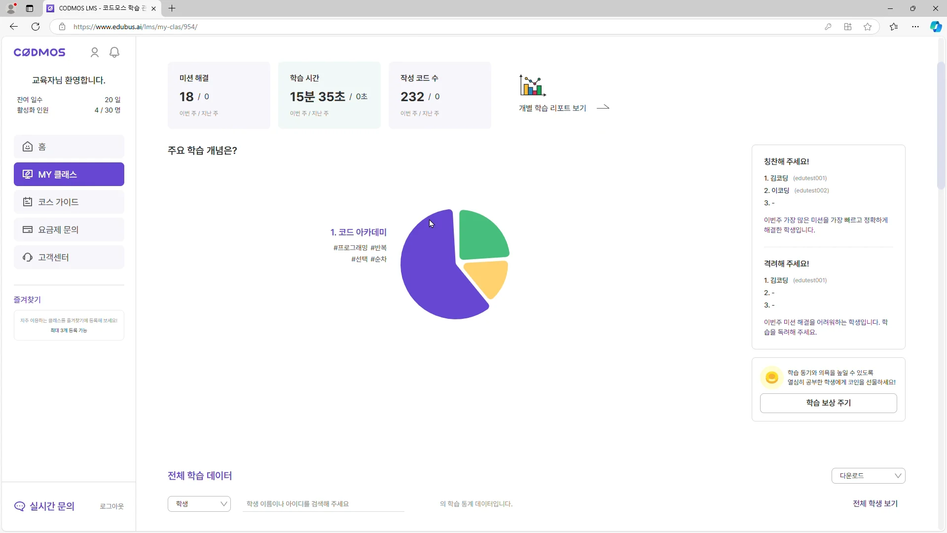 SW/AI 코스웨어 코드모스 역시 많은 학교에 도입되어 교원들의 업무 경감에 많은 도움을 주고 있습니다. 학습자 중심의 인터렉티브형 교육 콘텐츠 뿐만 아니라 데이터와 AI를 기반으로 학습 관리 보조 도구, LMS 2.0을 탑재했기 때문인데요. 특히나 정보 교과 선생님이라면 교육 콘텐츠와 학습 관리 시스템을 갖춘 코드모스를 고려해보시길 바랍니다!