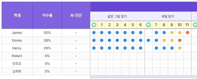 학생이 각 미션을 얼마나 잘 수행했는지 ‘잘함’, ‘보통’, ‘노력’, ‘실패’로 구분하여 시각적으로 명확히 제공합니다.