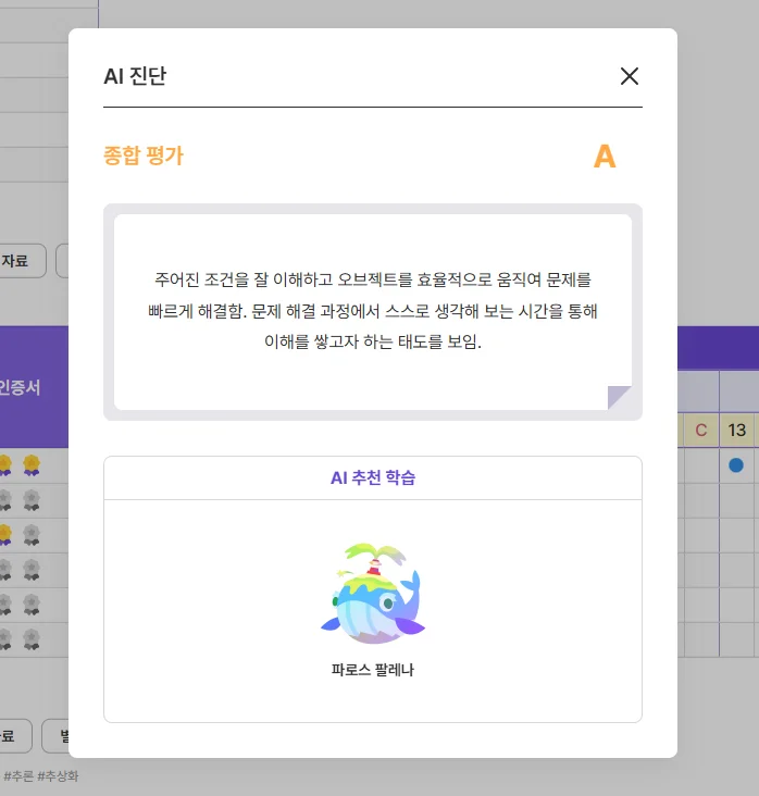 각 학생의 학습 데이터를 종합하여 AI가 직접 학습자의 종합 평가와 추천 콘텐츠를 제공합니다.